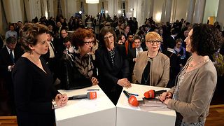 Talkrunde mit den Gattinnen der Spitzenkandidaten von SPD, Grünen, CDU und FDP: SWR-Moderatorin Edda Markeli (Bildmitte) im Gespräch mit (v.li.n.re.) Tülay Schmid, Gerlinde Kretschmann, Barbara Wolf und Karin Kropp.
